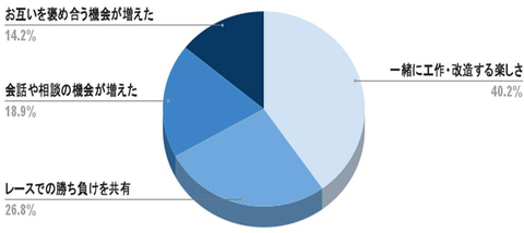 ミニ四駆が親子のコミュニケーションによい影響を与えるか尋ねたところ、「そう思う」が70.7%、「ややそう思う」が29.3%だった。回答者全員がよい影響を与えると回答しており、親子で共有できた体験や学びは「一緒に工作・改造する楽しさ」(40.2%)、「レースでの勝ち負けを共有」(26.8%)、「会話や相談の機会が増えた」(18.9%)、「お互いを褒め合う機会が増えた」(14.2%)と回答している。