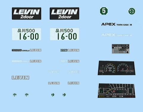 「トヨタ カローラレビン 1600GT APEX」にエアロパーツが付属して復刻登場。後期型用フロントバンパーが封入されており、一体成形(前後面・側面・屋根)のボディパーツに取り付けて再現することができる。デカールにはロゴ、ナンバープレート、デジタル式のメーターパネルなどを収録。