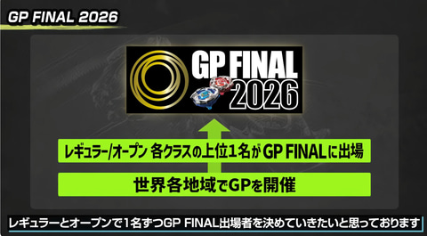 配信番組では世界大会「BEYBLADE X GP FINAL 2026」へ日本からどうすれば参戦できるかが語られた。これらは世界各地で行われる国内大会の「レギュラークラス(6歳以上12歳以下)」と「オープンクラス(年齢制限無し)」の各1名が参加できる。