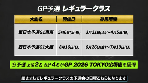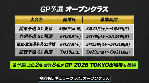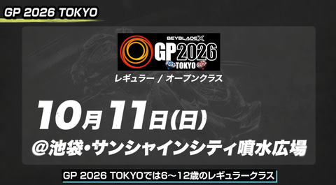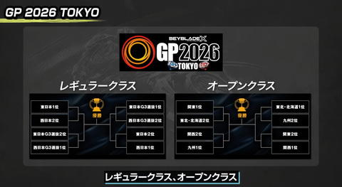 レギュラークラスではこれに加え公認店で開催される「B4ストアG3大会」で勝ち進んだ競技者が参加できる「G3選抜大会」の勝者も「BEYBLADE X GP 2026 TOKYO」参加枠が用意されるという。