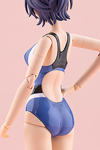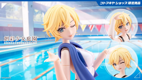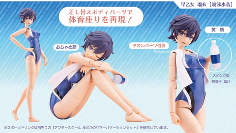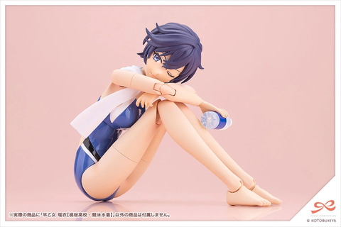 本商品は「創彩少女庭園」のキャラクター「早乙女 瑠衣」を競泳水着スタイルでプラモデル化したもの。新規造形の競泳水着ボディは水着部分が光沢感ある仕上がりとなっている。立ち姿用の上半身パーツのほかに、「体育座り用ボディ」が付属し、様々なポージングが楽しめる。