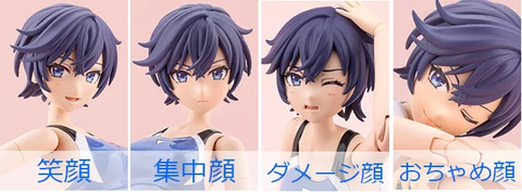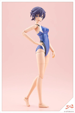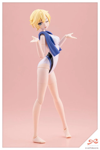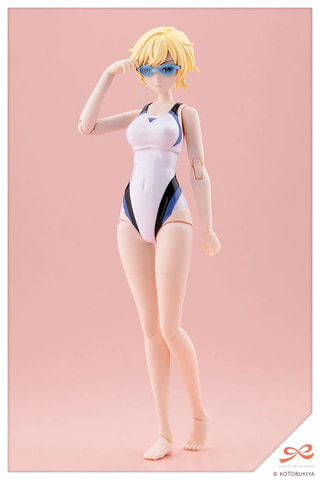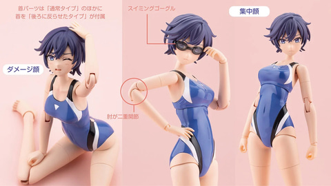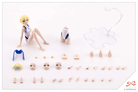 付属小物のタオルと新規造形の手首「スイング式の持ち手(広)」、「メガネ用前髪に対応したスイミングゴーグル」が付属。表情パーツは「笑顔」「おちゃめ顔」「集中顔」「ダメージ顔」の4種類となっている。コトブキヤショップ購入特典では「ヘアアレンジパーツ」がもらえる。