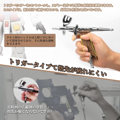 本商品は、真鍮製ボディ・クルミ材のハンドルのトリガー式エアブラシ。作動方式は長時間の作業でも指が疲れにくいトリガータイプが採用されている。エアーをコントロールし、スプレー途中でも簡単に噴出量を調整可能。0.3mm口径のほか、0.5mmと0.8mm口径が付属し、用途に合わせて手軽に交換できる。