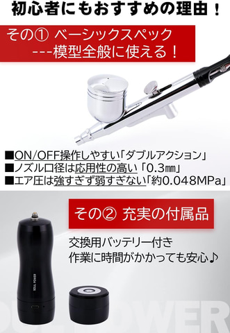 ON/OFFの切り替えが簡単な充電式エアブラシ。ハンドピースの押しボタンを押して、引くだけのかんたん操作で塗装が行なえる。エア圧が安定しており、ムラなく塗れる。残電量がランプの点灯・点滅で確認できるため、バッテリー交換のタイミングが目視で分かりやすくなっている。ガンダムマーカーエアブラシにも接続可能。