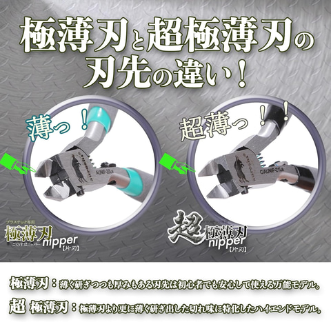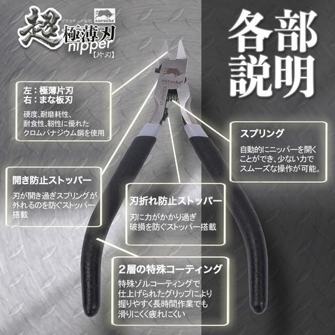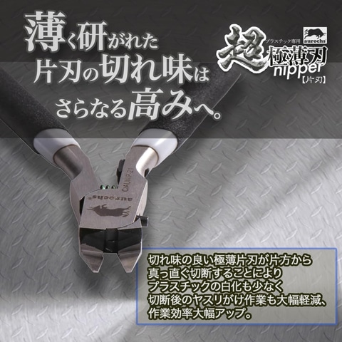 超極薄に仕上げられた片刃構造のプラスチック切断専用ニッパー。薄く繊細に研ぎ出された刃先は通常のニッパーよりも美しくゲートを切断できる。切れ味の良い極薄片刃が片方から真っ直ぐ切断することにより、プラスチックの白化も少なく切断後のヤスリがけ作業も大幅に軽減し、作業効率がアップする。