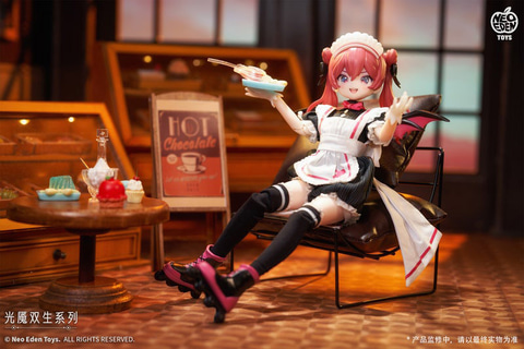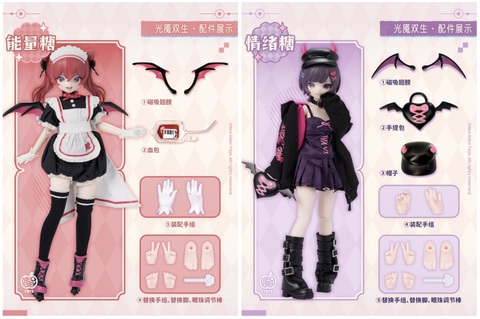 本商品は全高約22cmのオリジナルMJD(メカニカルジョイントドール)素体を使用したトレーディングドール。洋服は純白の天使やダークな小悪魔など、それぞれの世界観に合わせた布製となっており、さらに各キャラクターの個性を引き立てる可愛らしくも少し毒のある「小物パーツ」が付属する。