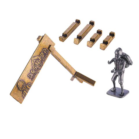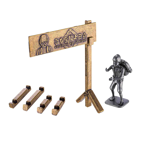 「はずす」ではなく「組み立て、支える」ことが目的のパズル。難易度は最大のレベル6で、手を放すと倒れてしまう看板と「カバンダ」、資材のセットとなっている。7ピースのセットで、資材は4つ同梱されている。