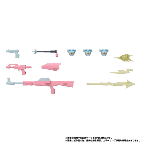 アクセサリーに3種の手持ち銃、ビークルに装着可能なクラッシャー、ホルスターが付属。手持ち銃に取り付け可能な3種類のエフェクトパーツも同梱される。また、通常フェイスに加え、表情が異なる3種の交換用フェイスが付属する。