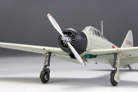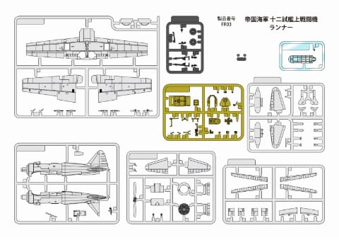 本キットでは、十二試艦戦「2号機」の仕様に基づき、零戦とは異なる各部ディテールを再現。胴体、翼、エンジン、プロペラはグレーで、脚部はブラック、機体内部は黄緑の3色成形が採用されている。