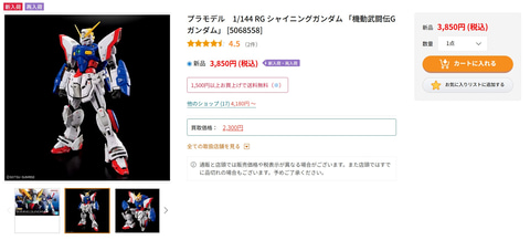 駿河屋にて、ガンプラ「RG 1/144 シャイニングガンダム」が販売再開している。価格は3,850円。