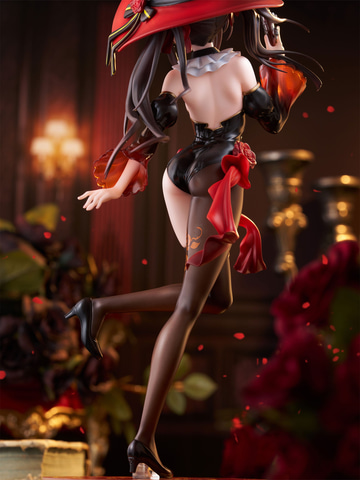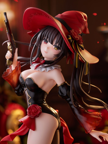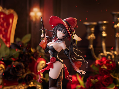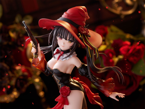 深紅の魔女帽子が特徴的なウィッチスタイルは、ポーズ・衣装ともにフリューオリジナルデザインとなっており、光沢感のある黒を基調としたコスチュームは細部まで丁寧に造形し、流れるような髪の動きや透け感を帯びた袖、腰元を飾るバラや短銃の質感など、随所にこだわりを詰め込んでいる。