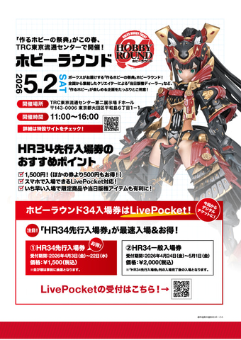 ボークスは、「作るホビー」の祭典「ホビーラウンド34」を5月2日にTRC東京流通センター第二展示場 Fホールで開催する。4月3日より、デジタルチケット「HR34先行入場券」の受付を開始した。価格は1,500円で、受付期間は4月22日まで。