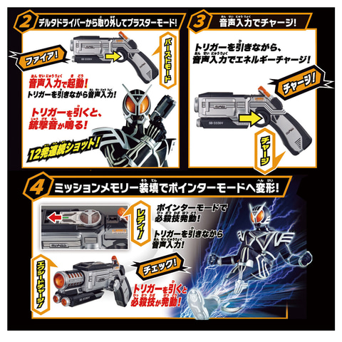 「ファイア」の音声入力で銃撃遊びができ、上部にミッションメモリーを装着することでポインターモードに変形。「チェック」の音声入力とトリガー操作で必殺技音声が発動する。