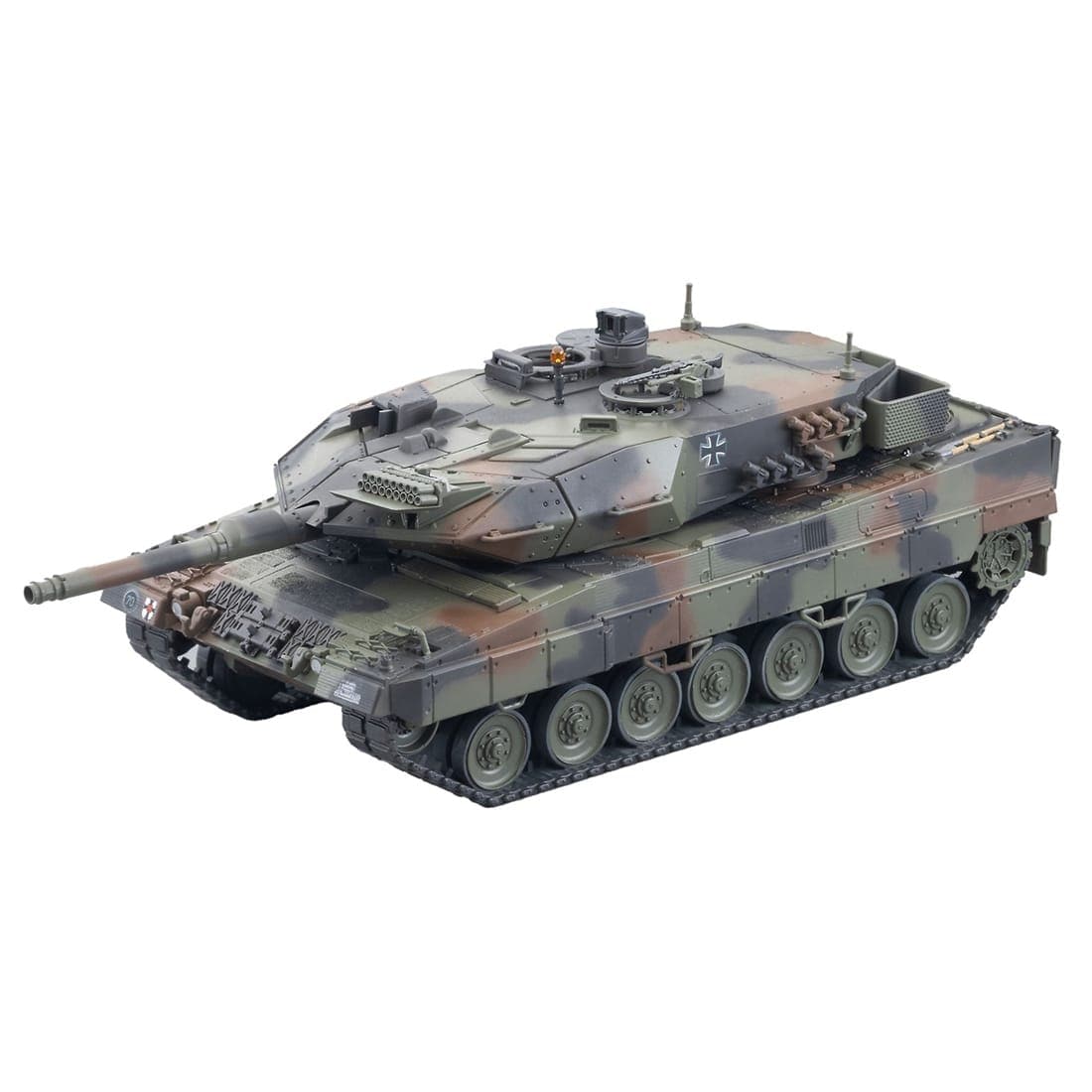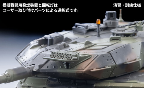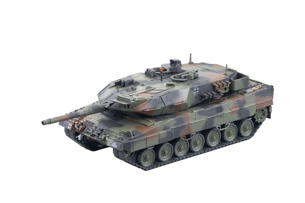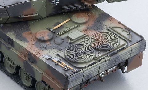 レオパルト2A5の各部形状を細かく再現しており、砲塔の旋回、主砲の仰俯角、車長パノラマサイトは可動。ユーザー取り付けパーツとして、模擬戦闘用発煙装置が付属するほか、ハッチの開閉と、天面の回転灯は選択式となっている。