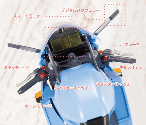 本商品は「創彩少女庭園」より新しいコンセプトの「エクストリームコンセプト」よりバイク本体をメインにしたアイテム。シャープなスポーツモデルのようなデザインで、サスペンションなどのメカ造形も表現されている。車体の下側には3mm穴が設定されておりウィリー走行でディスプレイすることができる。