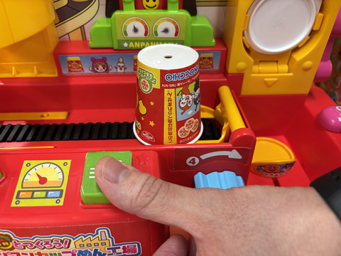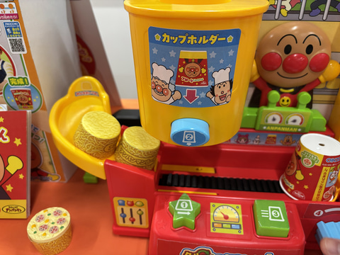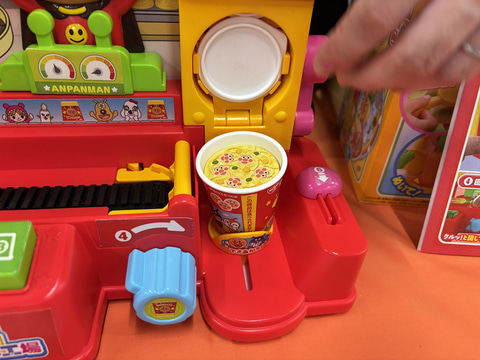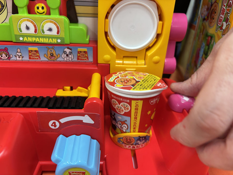 何よりカップをかぶせられたラーメンがベルトコンベヤーの右端まで移動して、くるりとひっくり返されるアクションが面白い。ひっくり返ったラーメンをのぞき込むとアンパンマンの顔がプリントされたかまぼこ画面の上に乗っているところも楽しい。もちろんのかまぼこは実際のラーメンでも使われている。地味な茶色の綿が、ひっくり返ることでアンパンマンの顔が見えるという子供を驚かせる演出、玩具の面白さを実感させてくれる。“玩具職人”ならではのアイディアと言えるだろう。