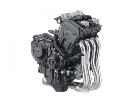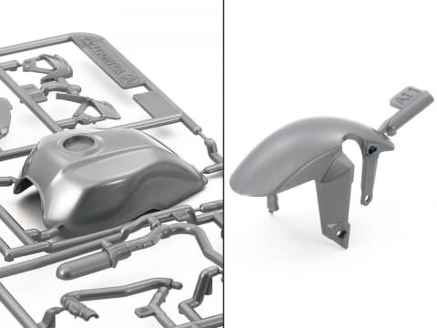 水冷直列4気筒エンジンは精密にモデル化され、流れるようなラインで構成された一体感あるフォルムがリアルに再現されている。エンジン、足まわり、マフラー、スタンドはフレームにビスで固定する。