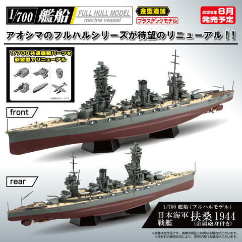 本商品は日本海軍の戦艦「扶桑」を大幅に対空火器を追加した太平洋戦争後期の姿で1/700スケールフルハルモデルで再現したもの。また、スライド金型を使用し、緻密かつ精密なモールドが施され、本キットでは高角砲、機銃を中心に、各種艤装がアップデートされている。