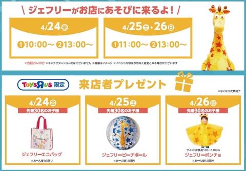 新店オープンを記念して、トイザらスオリジナルのおもちゃ・ノベルティグッズのプレゼントや公式キャラクター「キリンのジェフリー」のグリーティングなど、子どもたちや家族が楽しめるプレゼントやイベントが実施される。