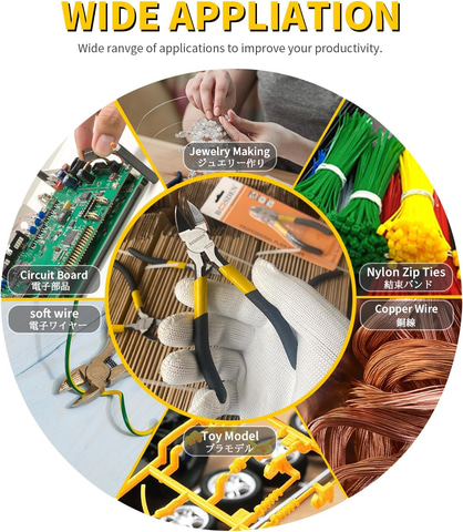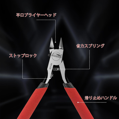 炭素鋼を使用し、さらに精密研磨加工を施すことでスムーズな切断を実現。電線(銅線・軟鉄線)やプラモデルのゲート処理、小型家電の補修、電子工作など、幅広い用途に対応する。刃先が鋭く、切り口も美しく仕上がる。