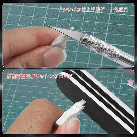 ニッパーは、片刃仕様の特殊ブレード設計により、パーツをきれいにカットできる。ニッパーのほか、替え刃付きペン型ナイフ(保護キャップ付き)、ストレート&曲がりピンセット、研磨バー、交換用スプリング、収納ケースなどがセットになっている。