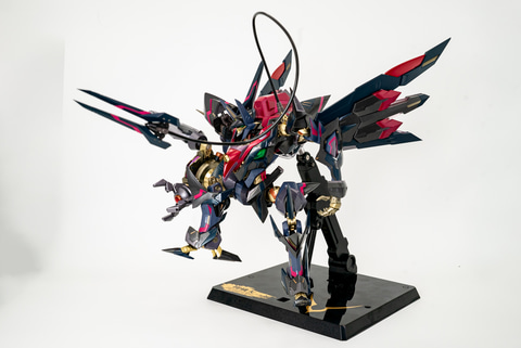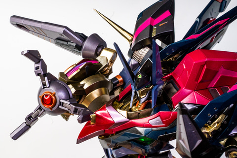 すべてのオプションを装着した「鞠熾天」は、息をのむほど美しい。なので、付属の展示ブース上でカッコイイポージングを決めて楽しもう。脚部からランドスピナーを引き出して滑走させてみたりすれば、「テケテケテテン。テケテテン」という「コードギアス」でお馴染みのBGMを脳内に流れるような気さえする。きっと、本作も映像化すればこのBGM聞けるんだろうなぁ。このように、ガシガシ動かしながらブンドドするのも悪くないが、METAL BUILDのパーツは繊細なパーツもあるので、丁寧に遊ぼうぜ。