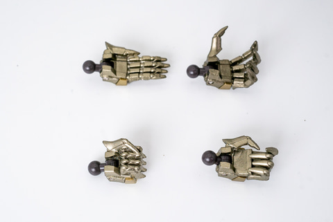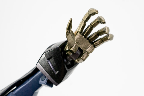 可動域で一番気になるのは、「腕」だろう。多重関節になっていてとにかくよく動く。両手を拡げることはもちろん。前腕を上腕にピッタリと折り曲げることが可能だ。また、手の造形も凝っていて、指の1本1本が動きそうなほどだ。さらに腕の可動に一役買っているのが、肩の二重関節で、肩アーマーが動くことで柔軟なポージングを決められるのだ!