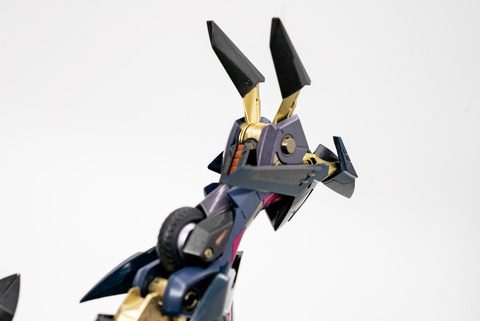 まずは、頭部から。頭は小さいながらかなり緻密なディテールで、ツノ部分にも太さの違うスジぼりがされているほど凝っている。可動としては、左右はもちろん、前後に大きく可動する。これは、首の付け根の部分のジョイントによる効果が大きいだろう。