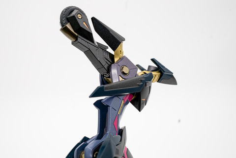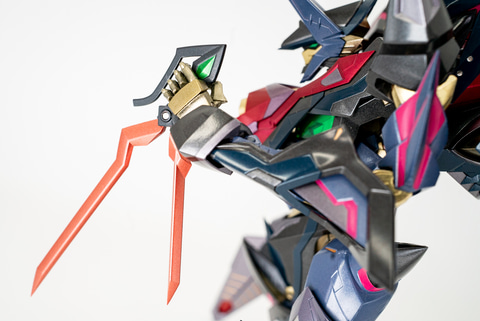 脚の造形も、腕以上にトゲトゲしさのエッジが効いているだけでなく、スジ彫りや形状の丁寧な感じがいい。これが半メタリックな塗装と相まって、小さいながらの重厚感を出している。