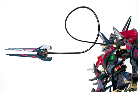 すでにお腹いっぱいな気もするが、これからが「鞠熾天」の組み立て開始。まずは、ナイトメアフレームの標準装備ともいえる「飛燕爪牙(スラッシュハーケン)」を両肩に取り付けよう。これがないと立体機動できないしね。なお、「飛燕爪牙」は付属の肩用ワイヤーで実際に飛ばしているようなシーンを再現できるぞ。また、開くギミックも搭載されているのがウレシイ。