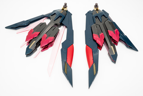 バックパック部分は、単体で見ると宇宙船かと思えるほど緻密なデザインをしていてカッコイイ。両側にはエナジー・ウイングを装備できる穴もある。実際に取り付けてみると完全に一体化しないので、後付けした追加装備感があっていい。なお、ハッチを開けるとゲフィオン弾を撃つシーンの再現も可能だ。