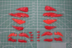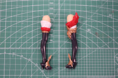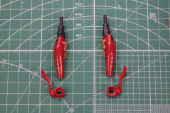 脚部の組み立ては腕部同様に左右非対称の造形となり、組み立て構成も異なる。右脚部は太もも部をホワイト、クリアーレッド、ゴールドの3層で構成されている。