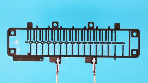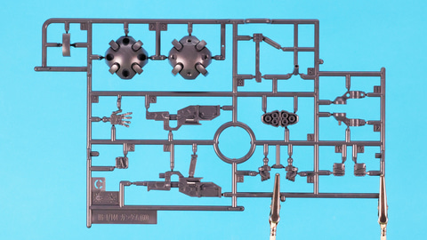 それではキットの内容をチェックしていきましょう。ランナーはA~H、SB-13、PC-7で11枚、シール2枚、組立説明書で構成されています。本キットは特殊な構成になっていてAという名のランナーが2種類あり、一つはアドヴァンスドMSジョイント技術によるチェーンのランナーです。これは「RG 1/144 RX-78-2 ガンダム Ver.2.0用武器セット」で採用されたガンダムハンマー用のチェーンで、ランナーから切り出すだけで組み立てることなく繋がったチェーンを実現するすさまじい技術です。