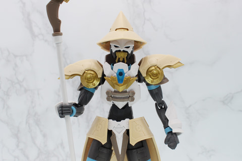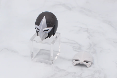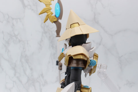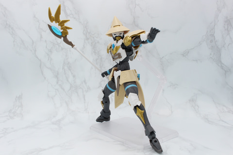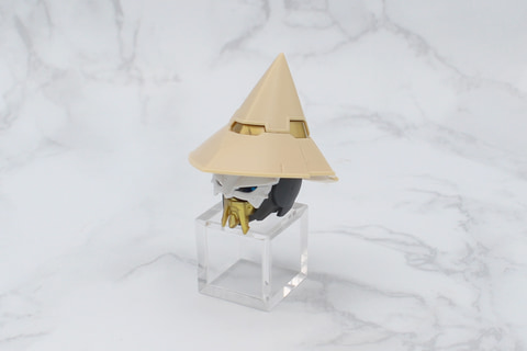 トレードマークのとんがり帽子は、内部にスリットが設けられていて、頭部に取り付けた突起をそこにはめ込む設計となっている。この設計により帽子の角度を違和感なく前後に変えることができ、ポージングの幅を広げている。口元のマスクは、髭を携えているようにも見え、ベテランの魔法使いのイメージが強調されている。