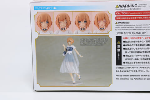 「ルミティア ReACT-iF」のパッケージは厚みのある箱タイプとなっており、お出かけを楽しんでいる「ルミティア」が描かれている。側面にはキットの作例イメージやポージング、各フェイスパーツが掲載されている。また、素組での完成写真も掲載されているので、組み立てる前にどこを塗るかの参考になる。