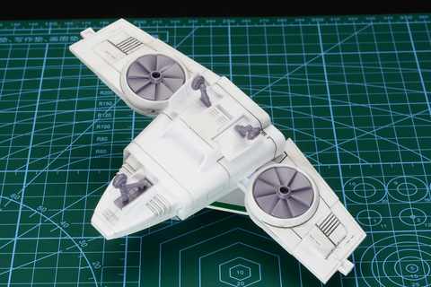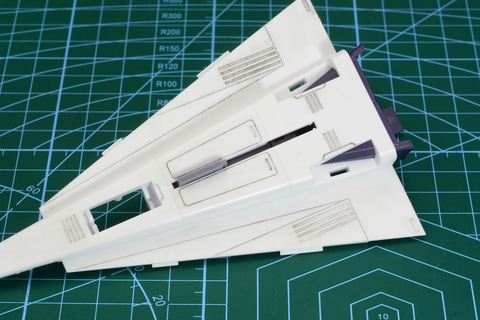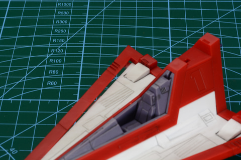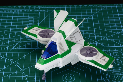 ガッチャ1号と、ガッチャ3号はランディングギアも設定されている。飛行状態だけでなく、駐機姿勢で飾れるのもうれしいところだ。なお、今回は組み立て時にウォッシングによるスミ入れを行っている。スミ入れにより機体のモールドが浮き出ており、よりかっこよくなる。