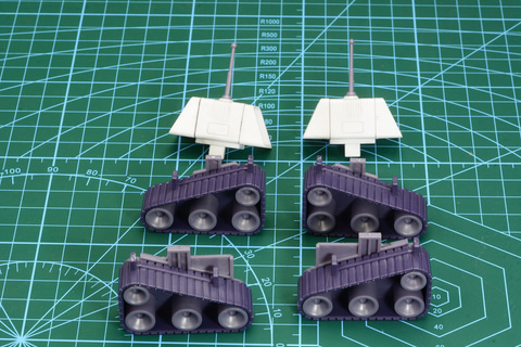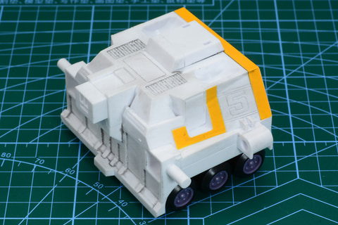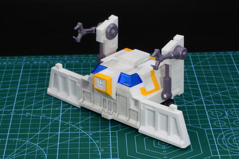 ガッチャ4号は燕の甚平が乗る飛行戦車。大きなクローラー(履帯)を持つ装甲車のような重厚なデザイン。組み立て時に合体時の姿にもするのだが、変形時のシルエットが大きく変わる機体だ。大きなクローラーは合体したガッチャスパルタンの姿でも印象的なパーツとなる。
