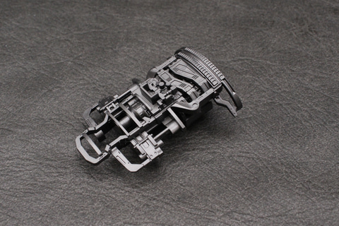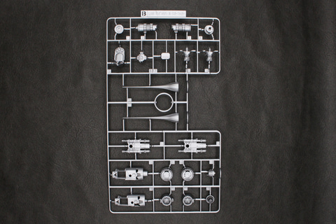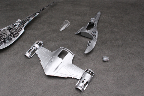 『マンダロリアン』版の「N-1スターファイター」の立体化ということで、ナブー時代の鮮やかなイエローの塗装はすっかり剥がされてしまい、金属がむき出しになった暗いシルバーの機体を成形色で表現している。パーツ自体はさほど多くなく、ランナーは台座も含め6枚だ。一部むき出しになった内部パーツは見えるところだけではなく隠れた部分も造形されていて、組み立て過程でそれを確認できるプラモデルならではのお楽しみも備えている。