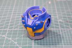 シールドの外側はブラックとブルーのパーツをはめ込んで劇中デザインが再現される。裏面は持ち手と回転剣のマウントパーツを取り付ける。