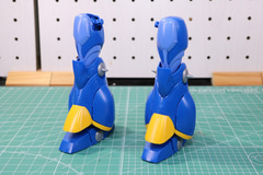膝部分は2重関節を備えつつ、下腿部に引き出し機構も備わっており膝の可動域を広げている。また、特徴的な下腿部の造形もパーツの積み重ねで、丸みのあるアーマーとフレームの色分けが再現されている。