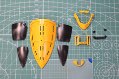 胸部は肩の引き出し機構を備えつつ、正面と背面でミルフィーユのように重ねて色分けや重厚感を演出している。また、正面のスパイク型のパーツも個別に造形され、差しこんでいく形となっている。