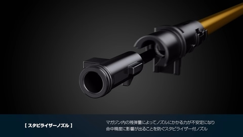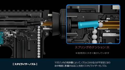 これまでの電動ガンではマガジンの残弾量によってノズルにかかる力が不安定となるため、命中精度に少なからず影響があった。それを改善したのが「スタビライザーノズル」だ。