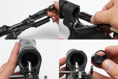 一方、やや慣れが必要なのがバッテリー交換。バッファーチューブの前方からバッテリーを収納するのだが、ケーブルの取り回し方をしっかり把握しなければならない。肝心なのは、バッテリー左側にケーブルを曲げて、ケーブル根元から挿入すること。また、バッテリーキャップ装着時には、ケーブルが溝に沿っていることを確認する必要がある。