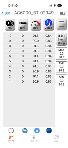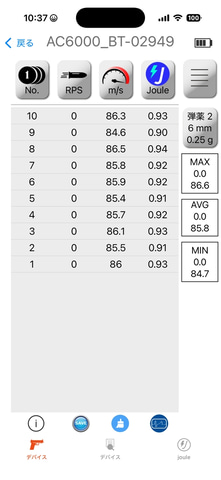 | 使用弾/ホップ | 最大初速 | 平均初速 | 最小初速 |