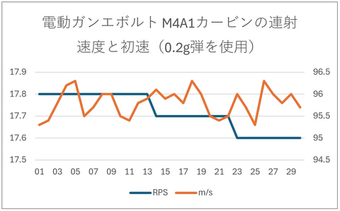一方、連射速度は最大17.8RPS、平均17.7RPS、最小17.6RPS。30発の連射速度を計測しているが、こちらも初速と同様に安定していた。連射速度自体は扱いやすいうえに、連射時にも着弾がかなりまとまる。30~40mの距離でもフルオートで全弾命中するポテンシャルを備えているので、0.3秒ぐらいで指切りして、オーバーキルにならないように心がけたいところだ。
