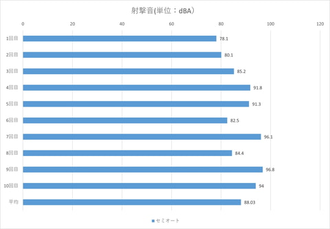 次は射撃音についてだが、セミオート時の射撃音は最大96.8dBA、平均88.03dBA、最小78.1dBA、フルオート時の射撃音は最大103.2dBAとなった。動作音はかなり低めに抑えられている。特にギアノイズはほとんど感じられなかった。
