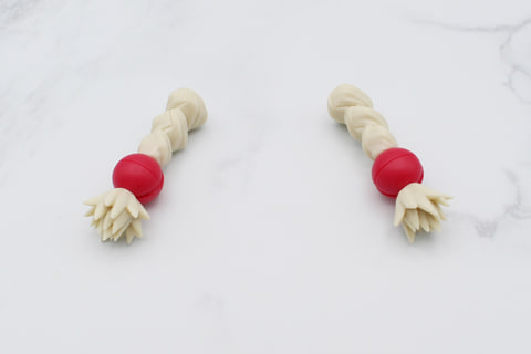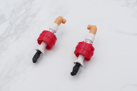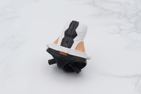 腕にはリング状の大きめの飾りがあり、肘関節とは別にある前腕のジョイントに接続することでスイング可動する仕組み。肘の動きに干渉はするものの、ポジションを調整することで90度前後まで曲げられる。