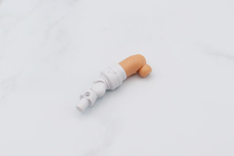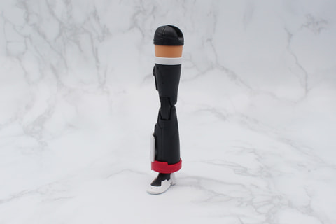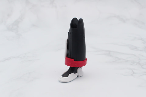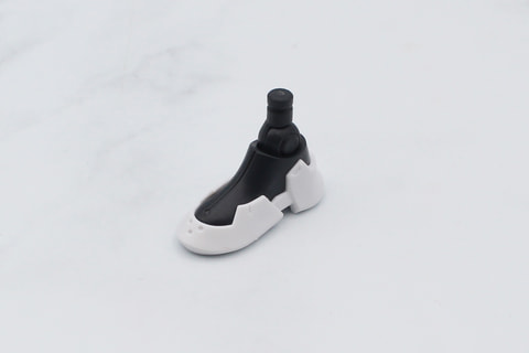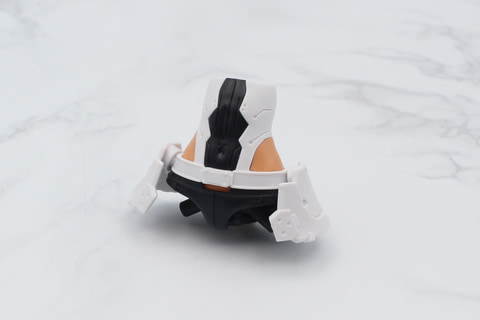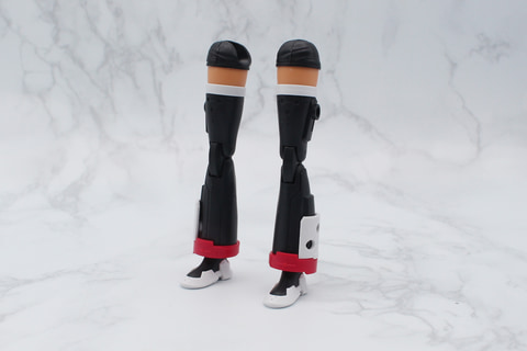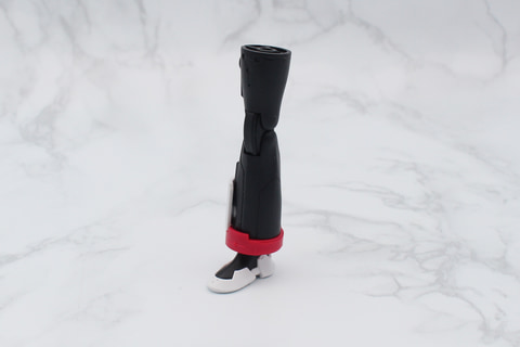 脚部は膝下の裾が広いフレアパンツのような形状が特徴。また太ももの付け根が別パーツになっていて、組み立てると腰と一体化してショートパンツのような形になるのも面白いところだ。太ももには左右の外側に3mmのジョイント穴があり、これを使ったカスタマイズも可能だ。