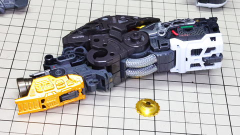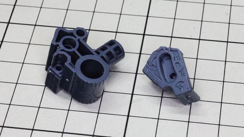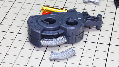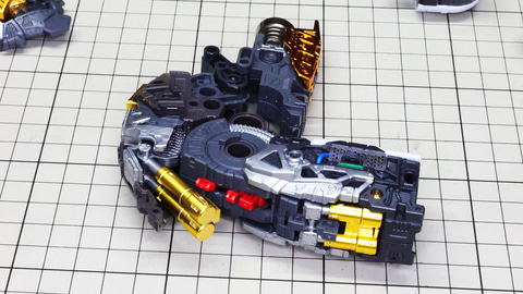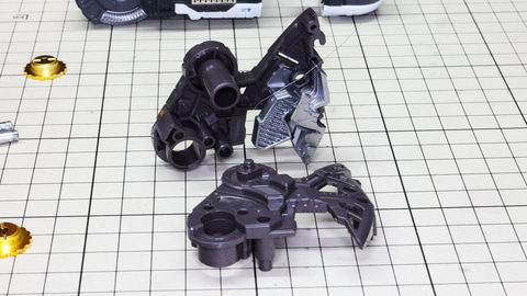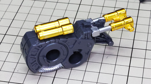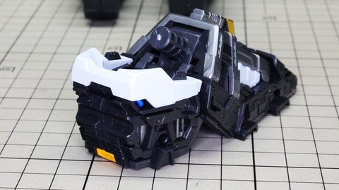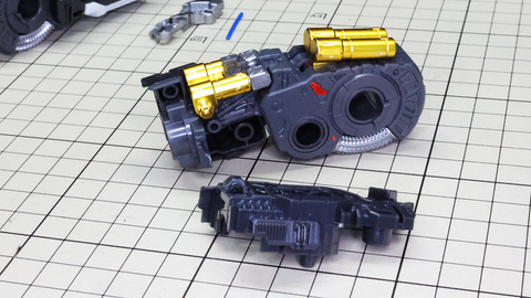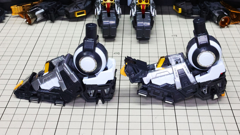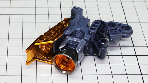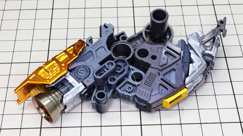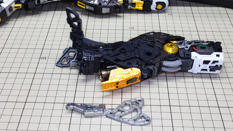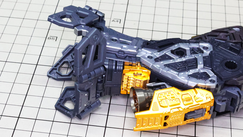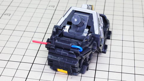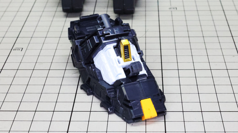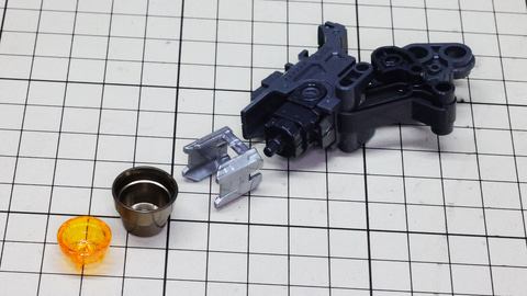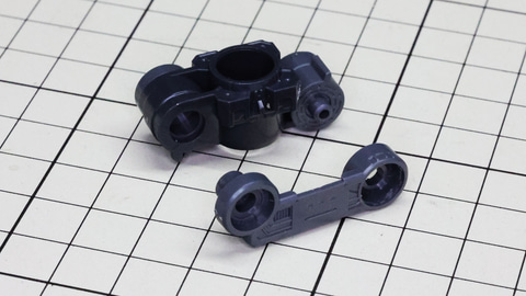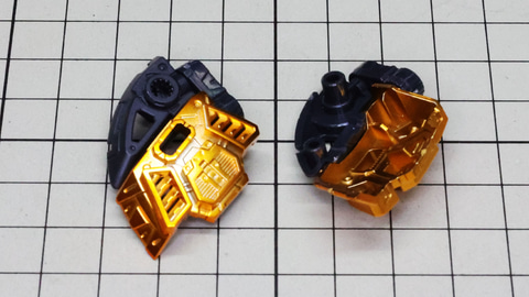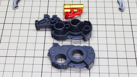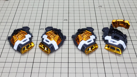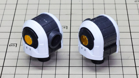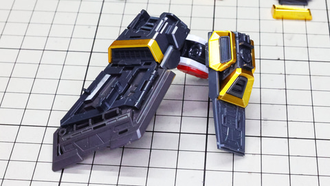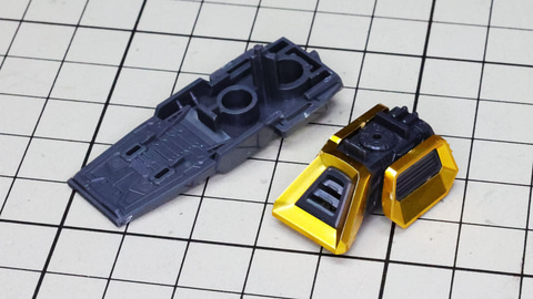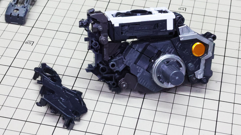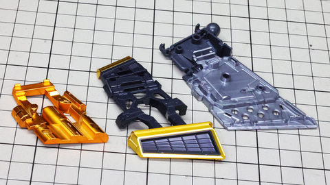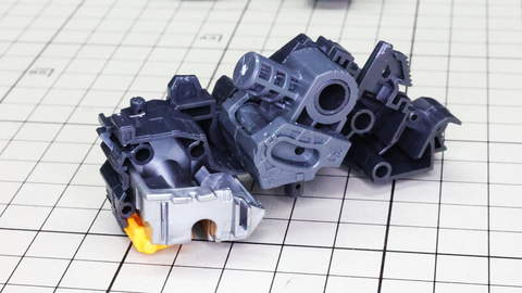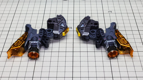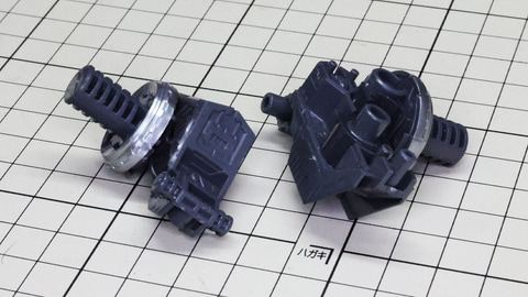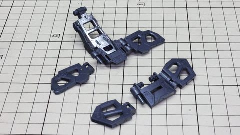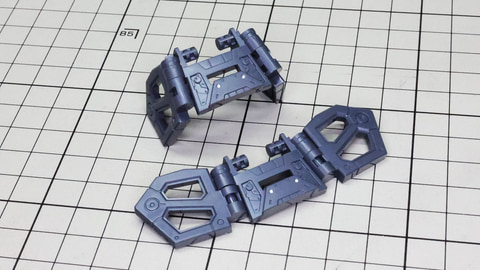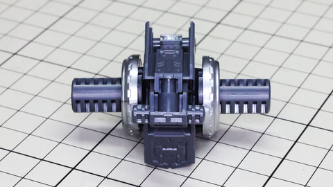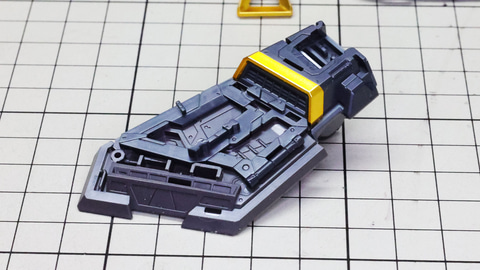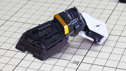 多数のパーツで構成され、剛性と可動性能が凝縮された腰部パーツ群 上半身とは太い軸穴で接続され、それ自体も可動するという大胆なギミックです 劇中ではしっかりと装甲材がついている描写があったのでそれを再現する装甲パーツが取り付けられます シルバーの加飾部もありメカニカルな印象を持たせています 左右は一つの軸で接続され、振り出し可動機構を形成します 腰部上面でフロントアーマーを接続する部分は劇中で表現されたように装甲材で覆われたデザインを再現しています サイドアーマーを組みます。補助スラスターはそれぞれゴールドの加飾が行われます リアアーマーを組みます。シルバーとゴールドの加飾が美しい! 無骨なメインフレームと金属色のサブフレームがメリハリがあってかっこいい!