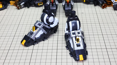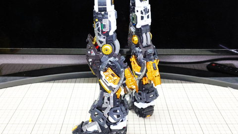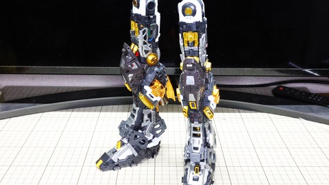 まずは脚部から組立開始です。さすが1/60スケール! 各パーツが大きいし多数のパーツで構成されますので、組み立て説明書に沿う形で進めていきたいと思います。流れとしては、各部位ごとにクローズアップしてお届けしてまいります。今記事でのレビューフォーマットは基本的に機体右側用を先に組んでおき写真左側に配置、左側用の組み立て写真を右側に配置しています。